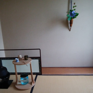 棚は木地の丸卓、ブルーの水指はガラス切箔で涼しさを感じていただくように。