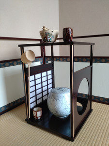 棚は「吉野棚」。丸窓から水指が見え、奥の障子が趣あります。